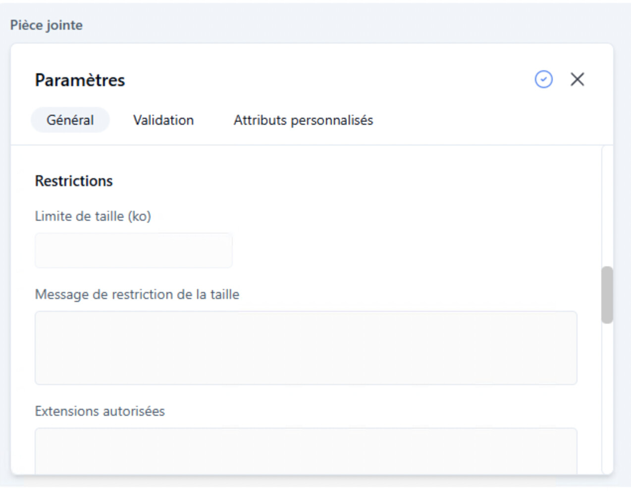 Depuis le formulaire, il est possible de limiter la taille des pièces jointes sur un champ directement.